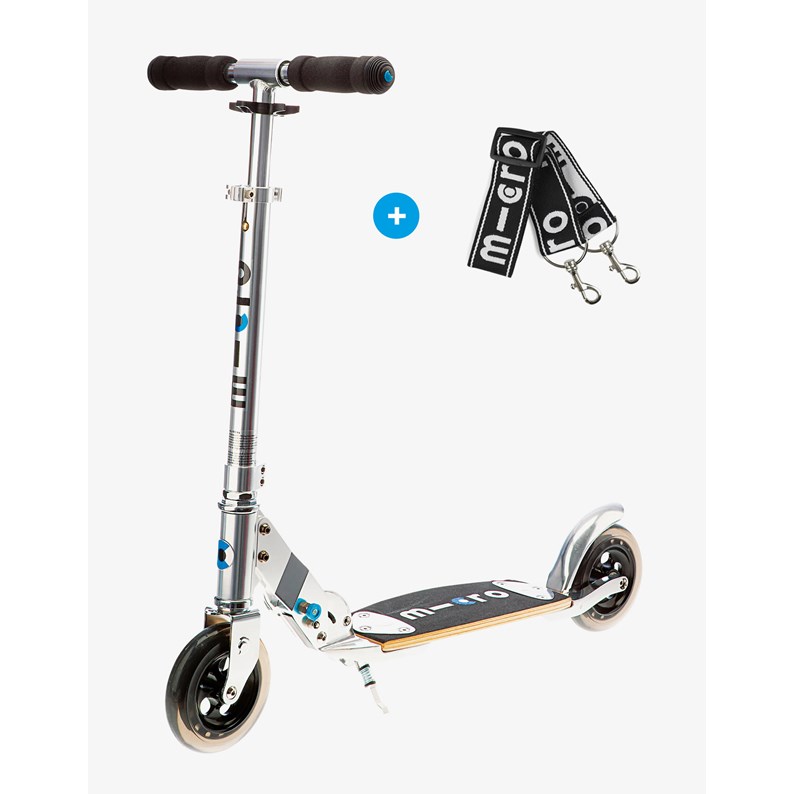 La Micro Flex tient son nom de sa planche, exceptionnellement flexible. Fabriquée dans un matériau unique à Micro, mélange de bois et de fibre de verre, elle absorbe les bosses et permet une glisse très confortable même sur des surfaces inégales. Les grandes roues (145 mm) renforcent cette facilité de glisse et les poignées en mousse (non-toxique) ajoutent au confort de cette trottinette. Équipée d'une béquille et livrée avec une lanière de transport.