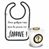 La pochette surprise contient :  Un joli bavoir mixte en pur coton avec l'inscription : - une attention pleine d'humour.