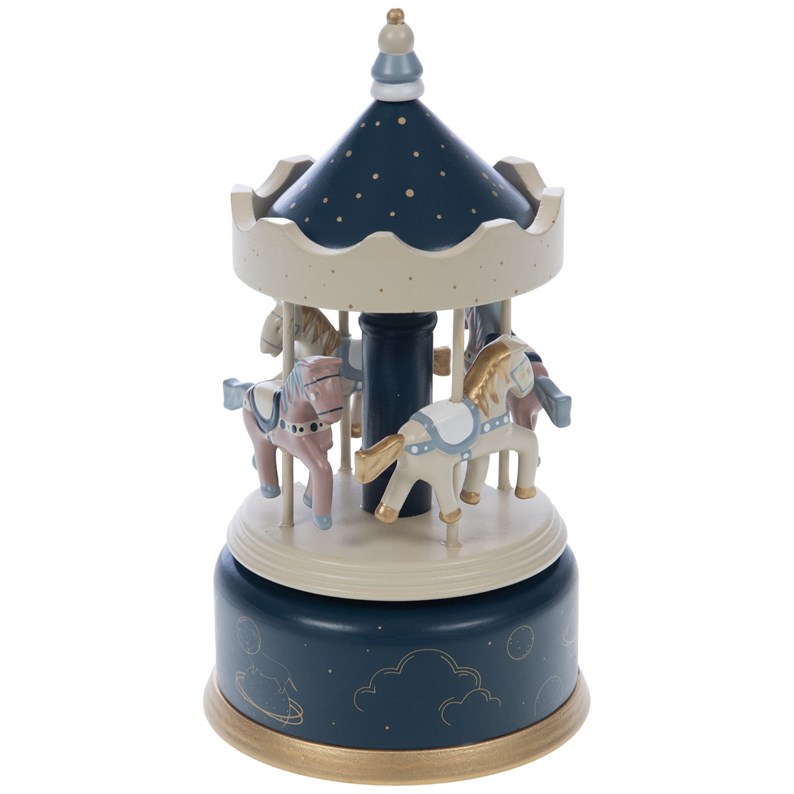 Ce sublime carrousel bleu et doré fait tourner ses adorables chevaux au rythme d’une mélodie douce et apaisante. Inspiré des manèges rétro, il apportera une touche féérique à la chambre de bébé. Il suffit de remonter le chapiteau pour voir la magie opérer ! Un cadeau de naissance élégant et intemporel, parfait pour accompagner les rêves des tout-petits.