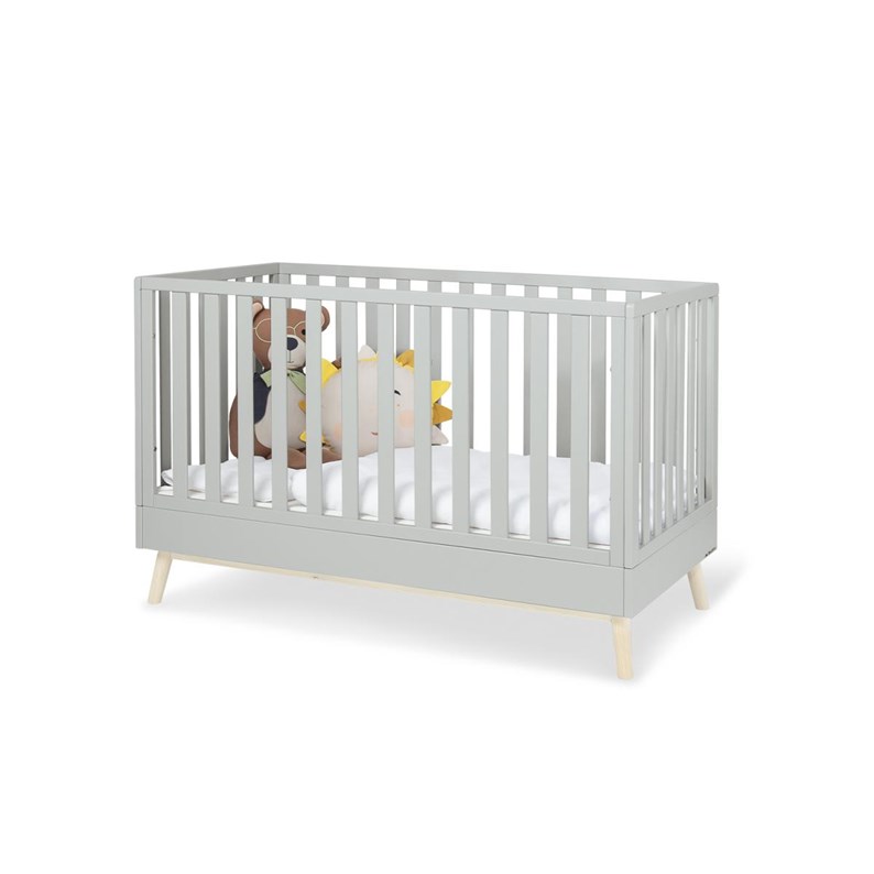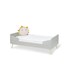 Lit d'enfant 'Dusk' avec 3 barreaux amovibles, sommier à lattes réglable en hauteur sur 3 positions, côtés transformables et coins transformables. Décor : uni, gris et massif, pin laqué transparent. Dimensions L 145 x l 76 x H 93 cm, dimensions du matelas 140 x 70 cm.