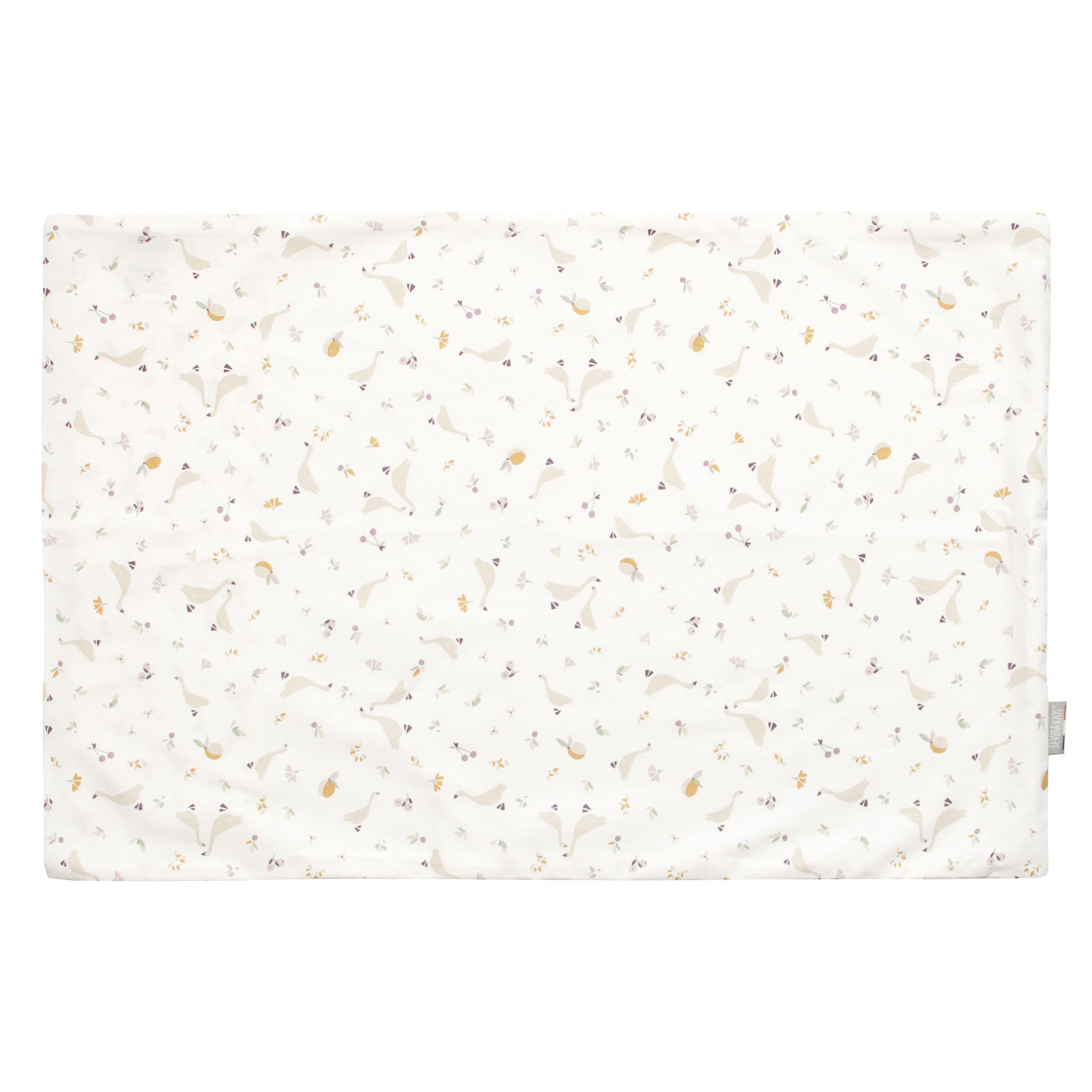 - Design réversible : Une face en coton imprimé avec des motifs d'oies, baies et fleurs, et l'autre en gaze de coton unie blanche pour un look minimaliste et élégant.