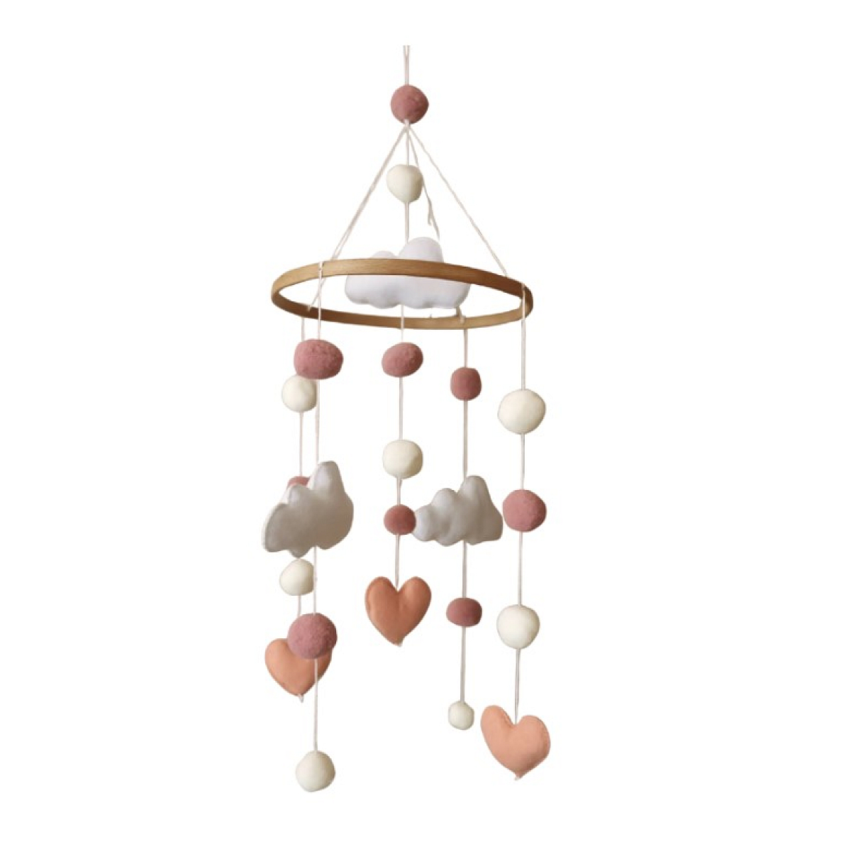 Un mobile en bois écologique et fait main. Si notre mobile lama est si apprécié, c?est pour ses caractéristiques et fait ses finitions haut de gamme :. * Des dimensions harmonieuses, soit un diamètre de 24 cm pour 50 cm de hauteur. * Des matériaux de qualité et eco-friendly, incluant feutre, fils de coton, bois et rembourrage hypoallergénique. * Un design élégant. * Des jeux de textures et de couleurs, pour le plaisir de bébé . * Une conception unique et des éléments cousus à la main. Dites désormais adieu aux longues soirées à bercer bébé : une fois l?heure du coucher arrivée, il prendra plaisir à admirer son joli mobile Coeurs en bois, tournoyant au-dessus de sa tête. Et si vous optez pour une boîte à musique, vendue séparément, vous aurez des heures de douces mélodies en perspective.