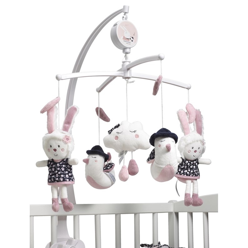 La potence du mobile, les arceaux ainsi que la boîte musicale ne sont pas des jouets, seuls les sujets du mobile peuvent devenir des jouets séparés (sujets lavables en machine à 30C).