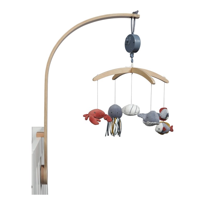 Mobile musical avec potence et 5 jouets suspendus - Bleu ocean, un mobile musical en bois de la marque Little Dutch, ref LD4843.Age minimum recommandé : 12 moisAge maximum recommandé : 2 ans