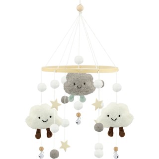 Ce mobile décoratif compte 19 éléments en feutrine (3 nuages et 16 boules), 3 étoiles et 3 billes en bois et enfin 3 clochettes en métal.