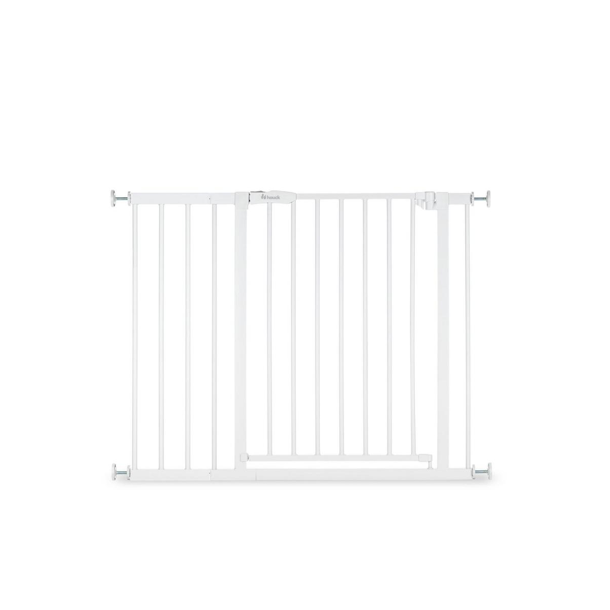 Ensemble de barrières de sécurité pratiques à fermeture manuelle pour les portes et les escaliers Dès que votre enfant est mobile. il devient essentiel d'utiliser des barrières de sécurité sur les escaliers et les portes pour protéger votre petit. Que ce soit à la maison. chez les grands-parents ou en vacances. la barrière se fixe de manière stable avec des vis de réglage à fixation par pression et elle se retire sans laisser de résidus. La barrière de sécurité s'ouvre d'une seule main des deux côtés et se ferme facilement. L'ensemble Open N Stop 2 avec son extension de 21 cm. ne convient pas seulement aux passages d'une largeur comprise entre 96 et 101 cm. mais il peut également être étendu jusqu'à 122 cm grâce aux extensions de 9 cm et 21 cm disponibles séparément. Avec des broches en Y Hauck séparées. la barrière de sécurité peut également être montée sur des escaliers avec des montants ronds. Les dimensions suivantes sont possibles avec des extensions séparées : 75 à 80 cm = barrière pour enfants sans extension84 à 89 cm = barrière pour enfants + extension de 9 cm93 à 98 cm = barrière pour enfants + extensions de 9 cm et 9 cm96 à 101 cm = barrière pour enfants + extension de 21 cm105 à 110 cm = barrière pour enfants + extensions de 9 cm et 21 cm117 à 122 cm = barrière pour enfants + extensions de 21 cm et 21 cm Remarque : cette barrière de protection est auto-ajustable. Cela signifie que l'inclinaison initiale/l'écart dans la zone du mécanisme de fermeture est supprimé en serrant les quatre vis de fixation.