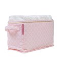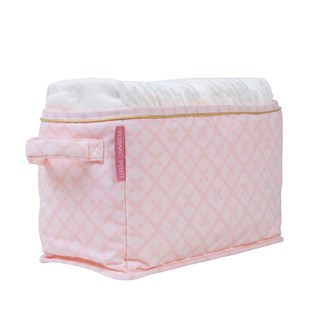 Bac à couches en tissu imprimé de motifs roses et rehaussé d'un passepoil doré.