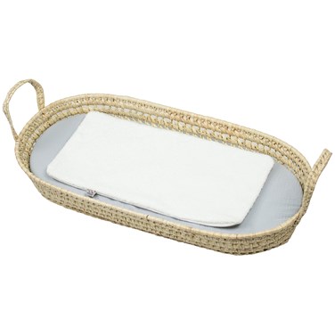 Transformez les moments de change en un instant de douceur avec notre set complet panier à langer , alliant artisanat naturel et confort textile . Ce set comprend un panier à langer tressé à la main en fibres de palmier, un matelas ovale fabriqué en France , un drap-housse en gaze de coton de la collection Jeanne et un tapis de change imperméable en bambou .