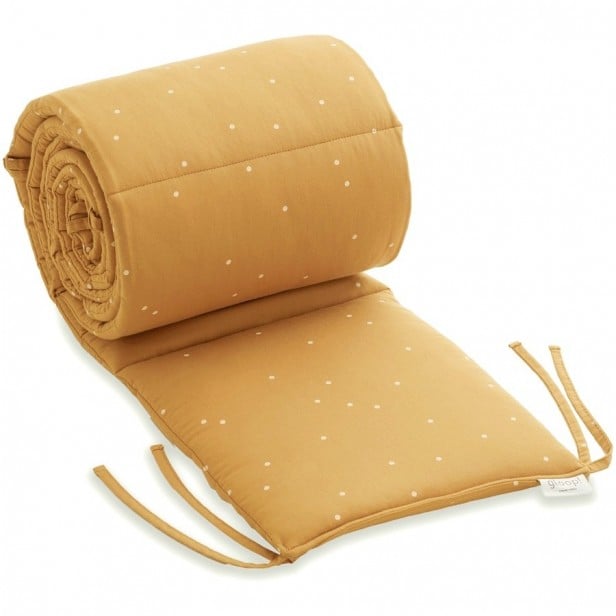 Il est dans des tons unisexes (pois blancs sur fond ocre et fait partie du thème Boho de Gloop.