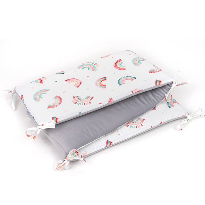 Le tour de lit Rainbow est confectionné en coton à partir de matériaux de haute qualité :- Une face en coton, et une face en velvet de qualité supérieure, garnissage en fibres de polyester anti-allergique, respirable, souple et doux