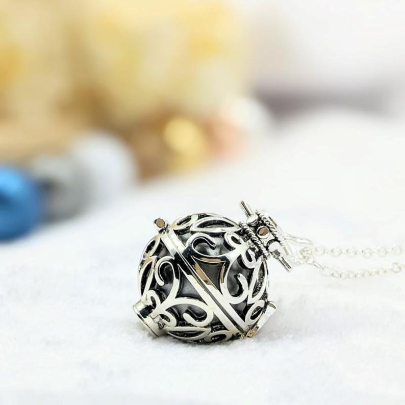 Ce bola de grossesse en forme de cage ajourée , réalisé en plaqué argent, est un bijou de maternité à la fois élégant et plein de sens. À l’intérieur se trouve une bille sonore grise , amovible, qui émet un tintement doux et apaisant à chacun de vos mouvements.