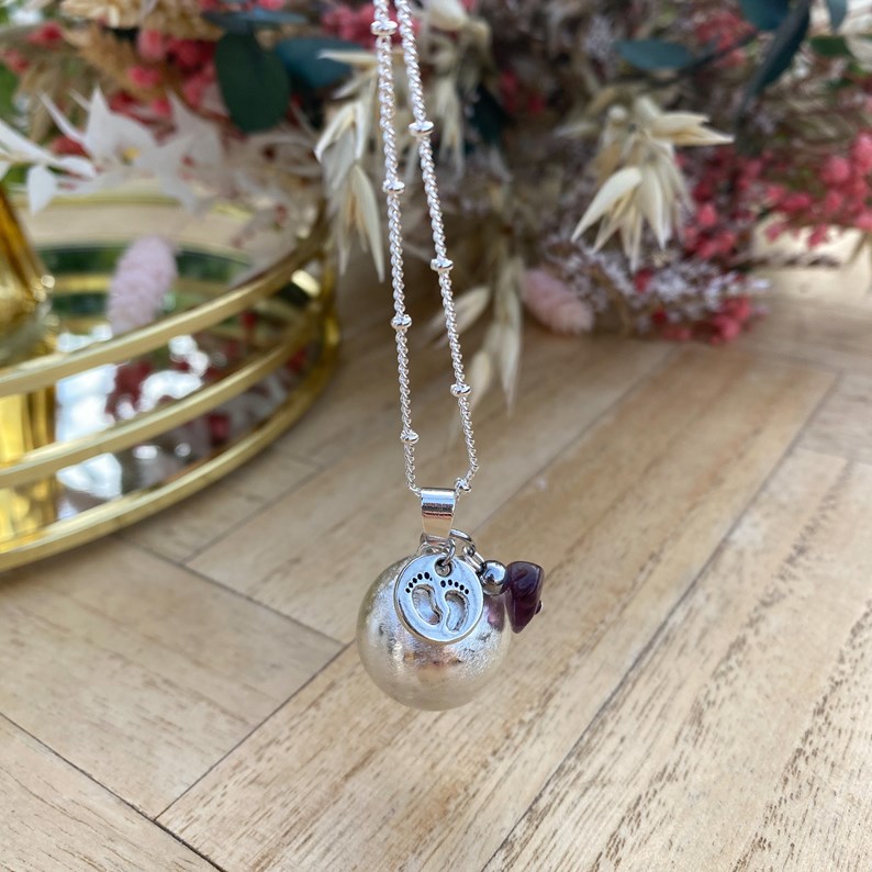 - Une breloque petit pieds et une améthyste viennent embellir le bola.
