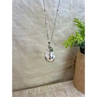 Chaîne en acier inoxydable de 105 à 110 cm et bola en plaqué argent 925. Perles en quartz rose et breloque arbre de vie en acier inoxydable.