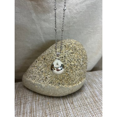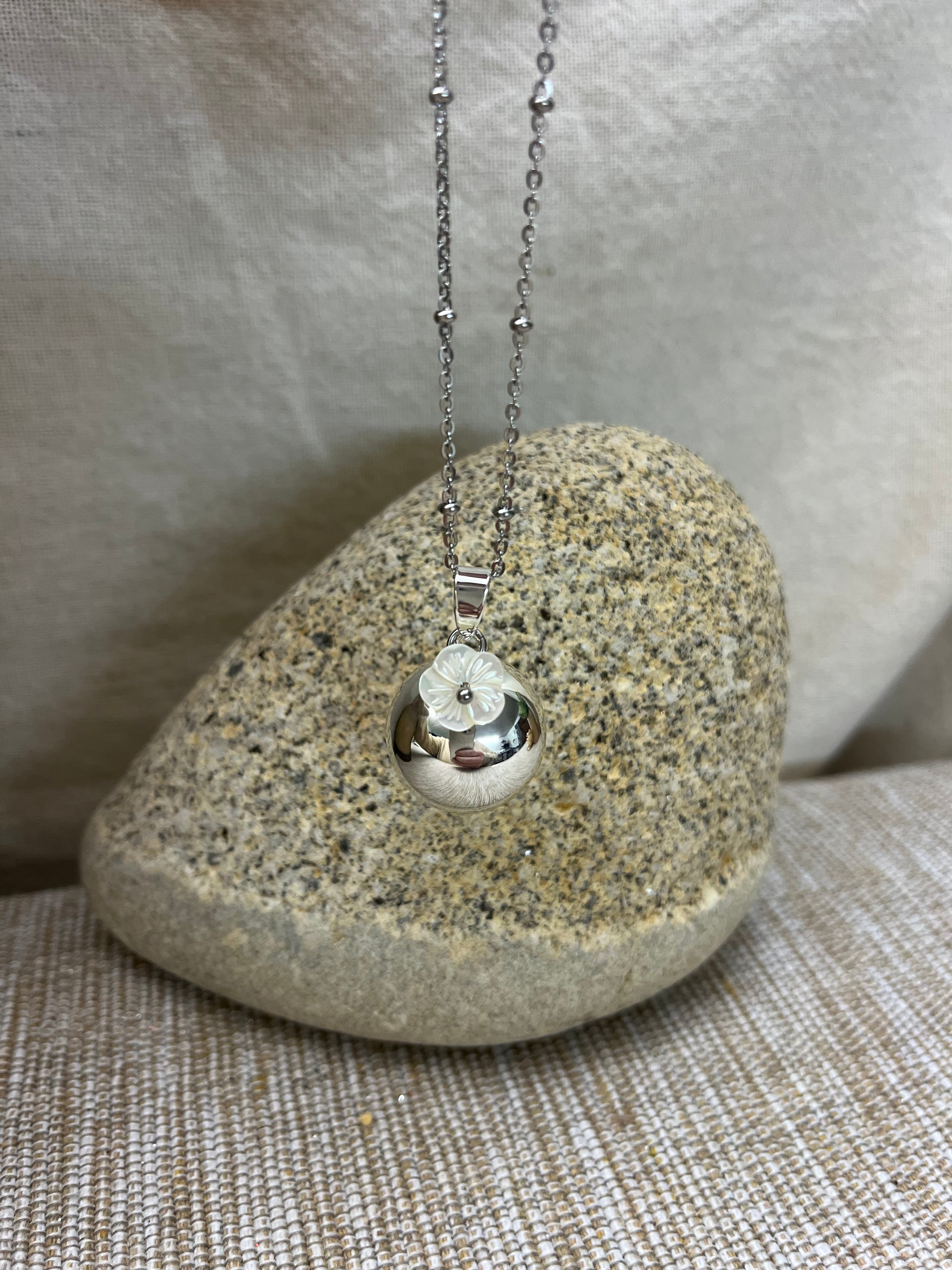 Chaîne en acier inoxydable de 105 à 110 cm. Bola de grossesse en plaqué argent 925. Fleur en nacre de 10mm.