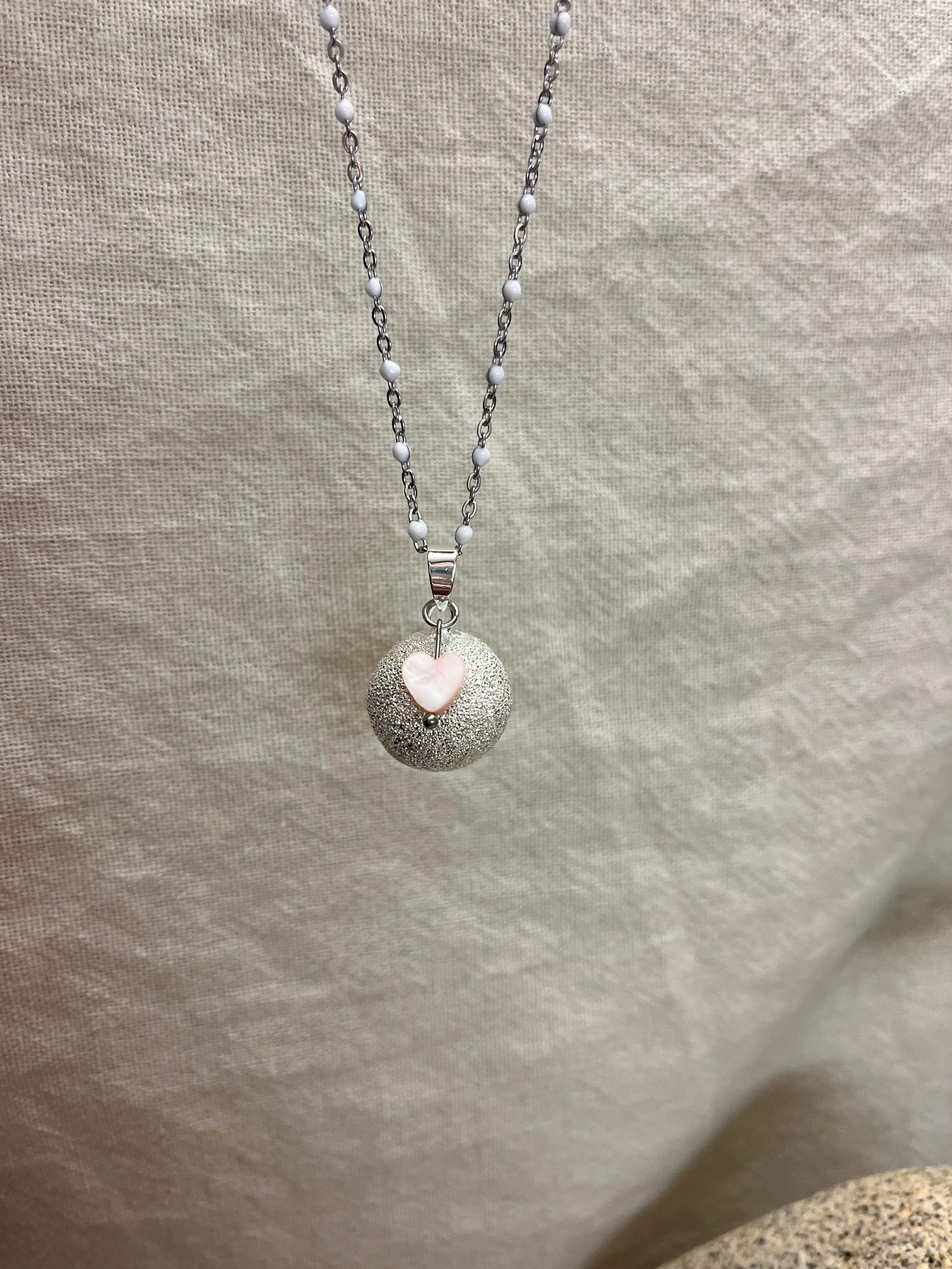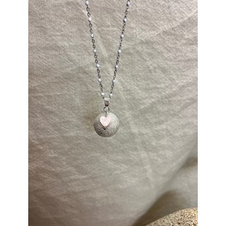 Dimensions & matériaux : Chaîne en acier inoxydable et bola effet strass, en plaqué argent 925. Petit cœur en coquillage de perles. Chaîne de 105 à 110cm.