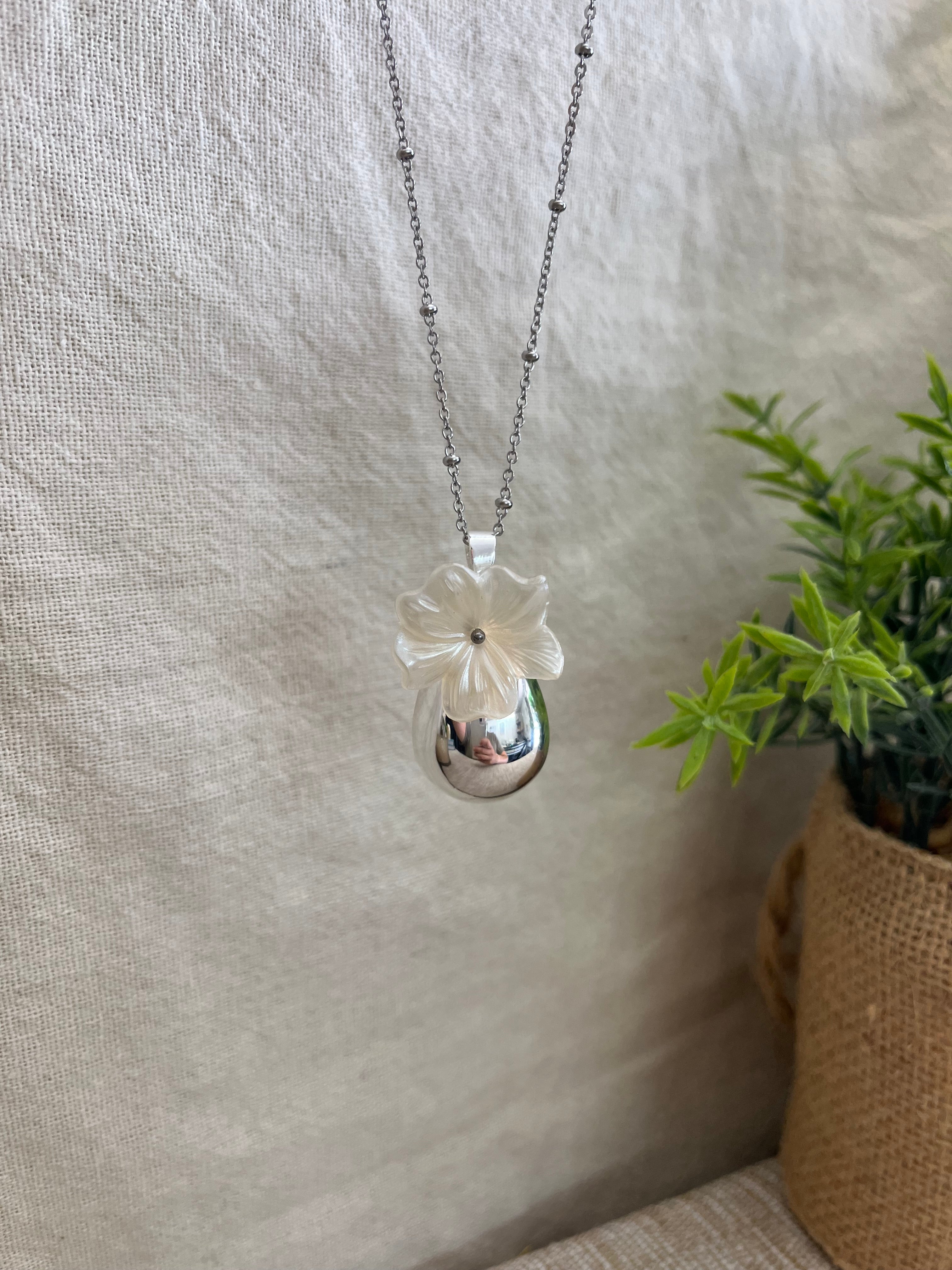 Chaîne en acier inoxydable de 105 à 110 cm. Bola de grossesse en plaqué argent 925. Fleur en résine transparente de 23mm.