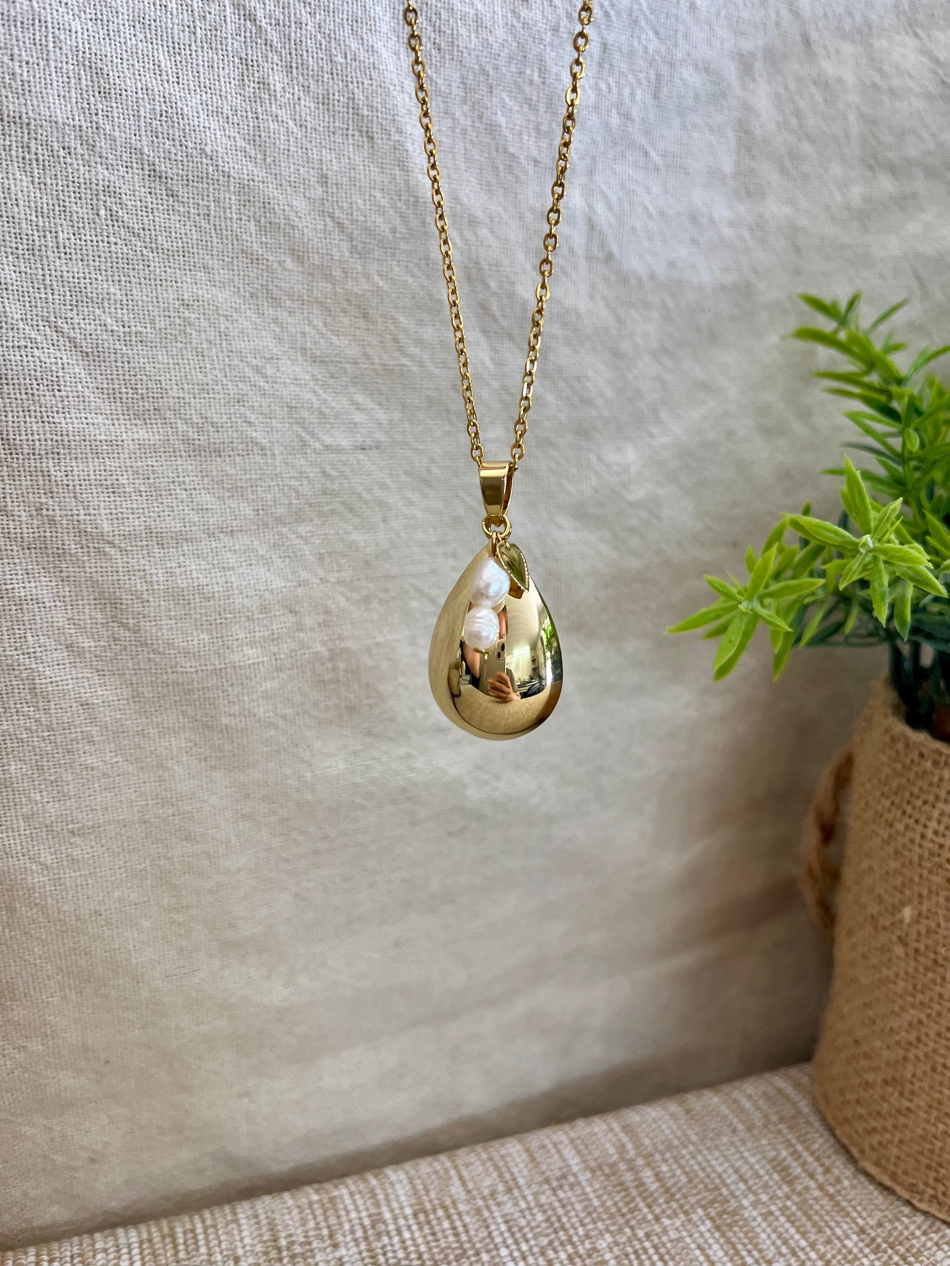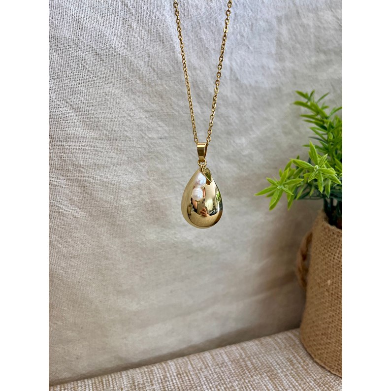 Dimensions & matériaux: Chaîne et breloque en acier inoxydable 105 à 110 cm. Bola en plaqué or. Deux perles d'eau douce.