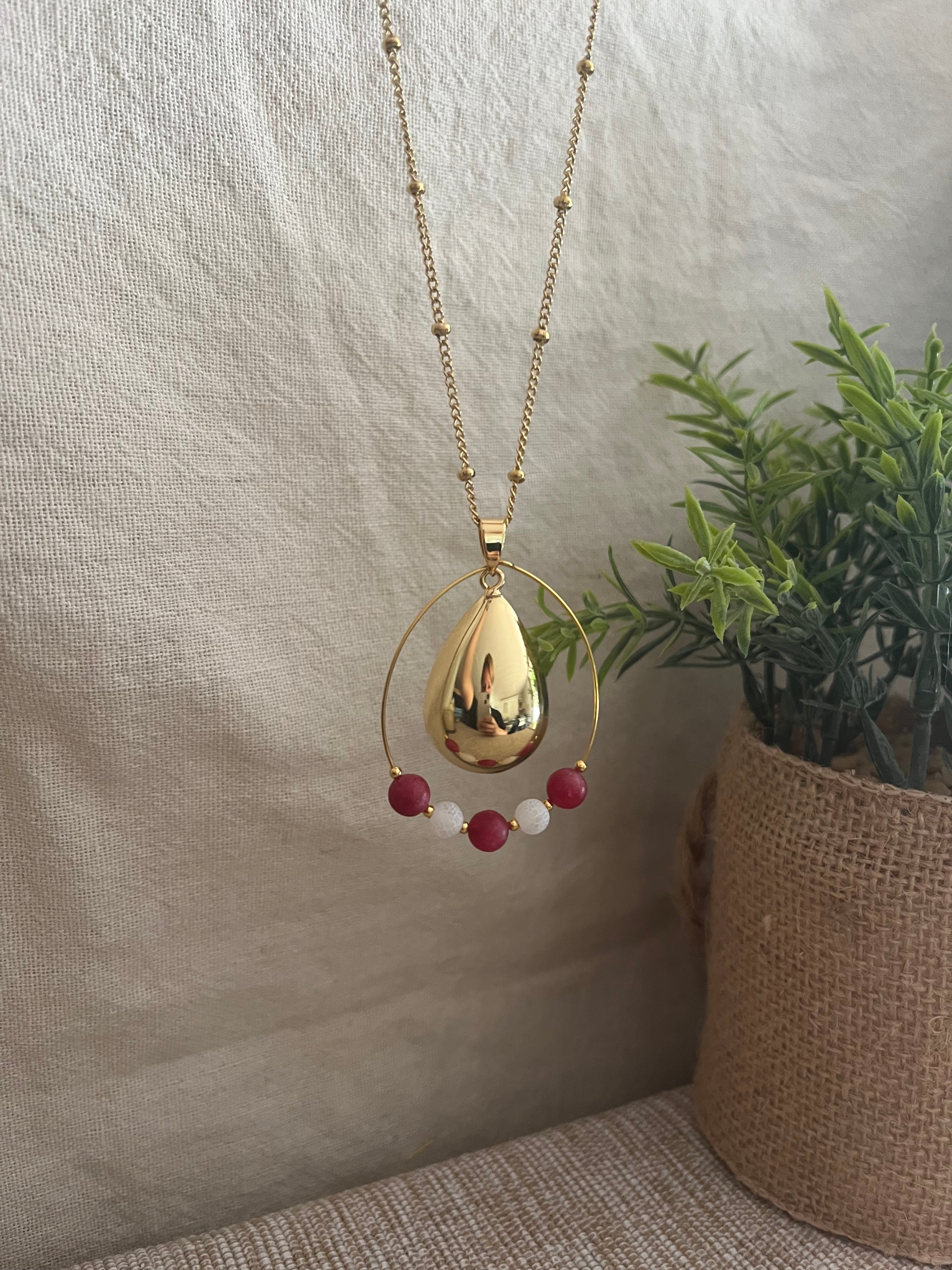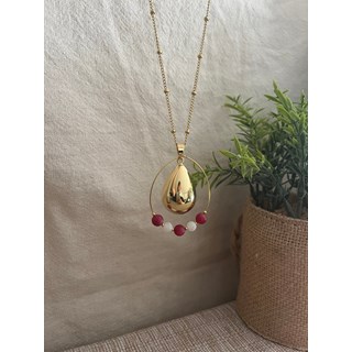 Chaîne en acier inoxydable de 105 à 110 cm, bola de grossesse en plaqué or, garanti sans nickel, sans plomb et sans cadmium. Le bola est accompagné de plusieurs pierres naturelles quartz et de pierres Calcédoine et Agate. On dit de ces pierres qu’elles ont un effet d’ancrage, calmant et qu’elle donne de la confiance.