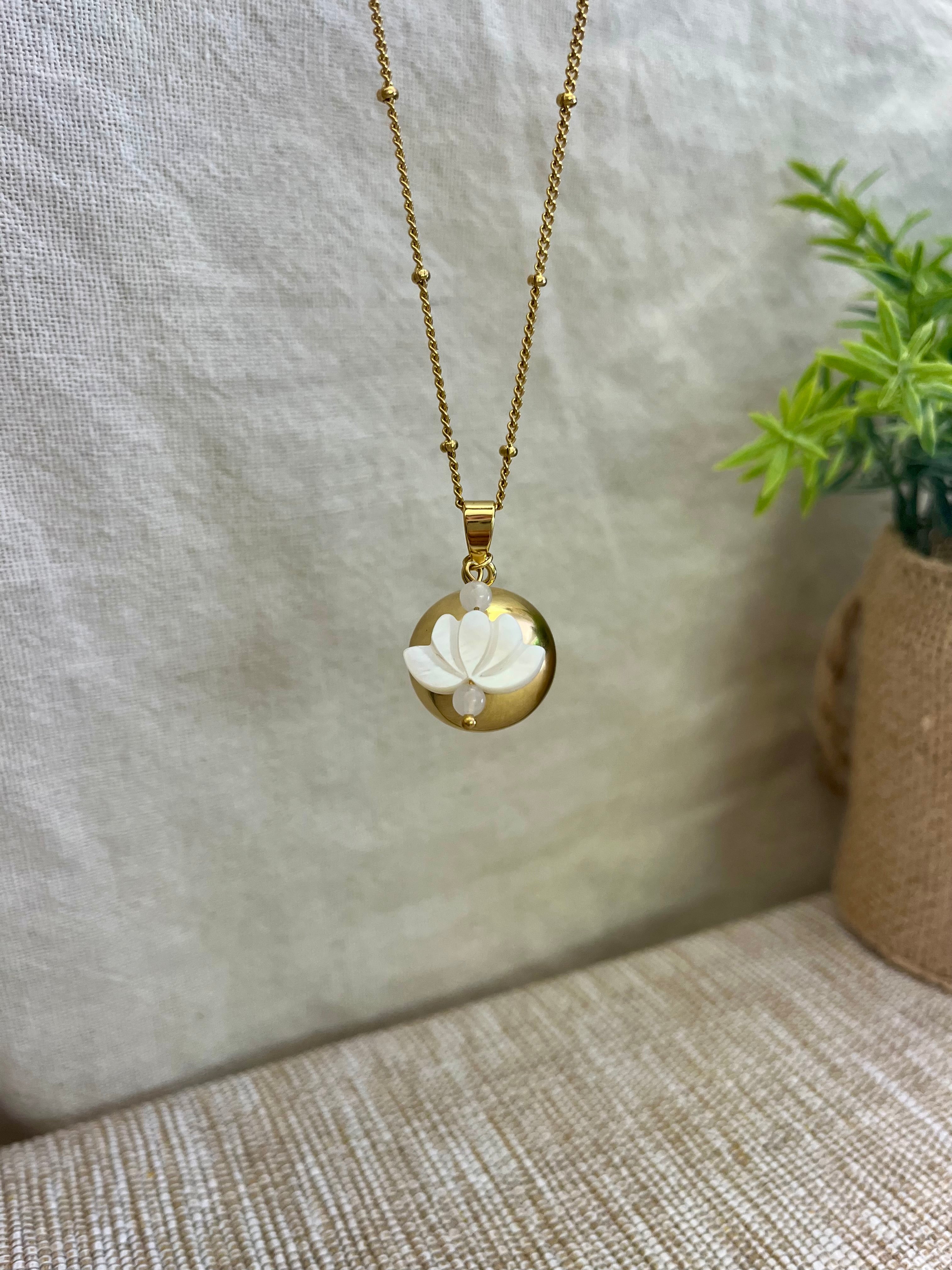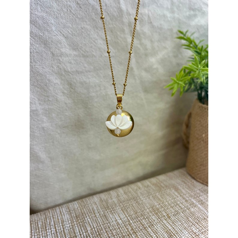 Chaîne en acier inoxydable de 105 à 110 cm, bola de grossesse en plaqué or, garanti sans nickel, sans plomb et sans cadmium. Le bola est accompagné d'une fleur de lotus en nacre et deux petites perles blanches en quartz.