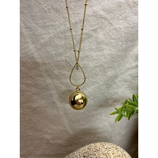 Chaîne en acier inoxydable de 105 à 110 cm. Bola de grossesse en plaqué or, accompagné d’un anneau de montage en forme de goutte en acier inoxydable et d’une mini breloque goutte en oxyde de zirconium.
