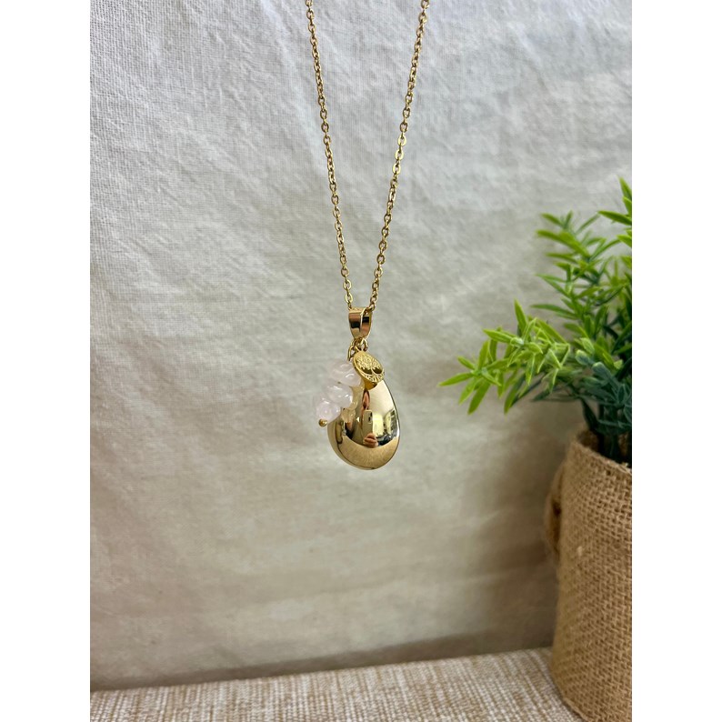 Chaîne en acier inoxydable de 105 à 110 cm et bola en plaqué or. Perles en quartz rose et breloque arbre de vie en acier inoxydable.