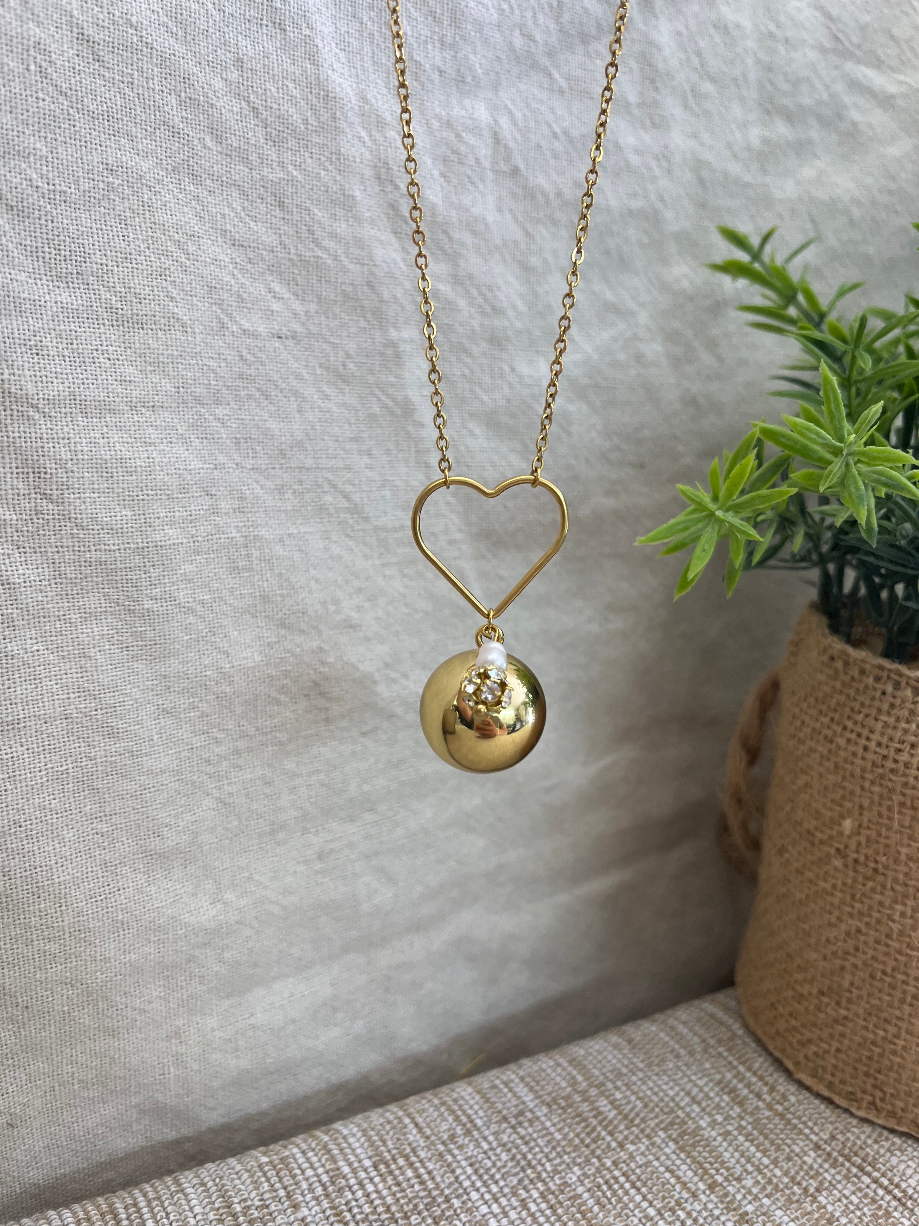 Dimensions & matériaux : Breloque en cœur et chaîne en acier inoxydable de 105 à 110 cm, bola de grossesse en plaqué or, garanti sans nickel, sans plomb et sans cadmium. Le bola est accompagné d'une perle d'eau douce et d'une perle en métal et Crystal.