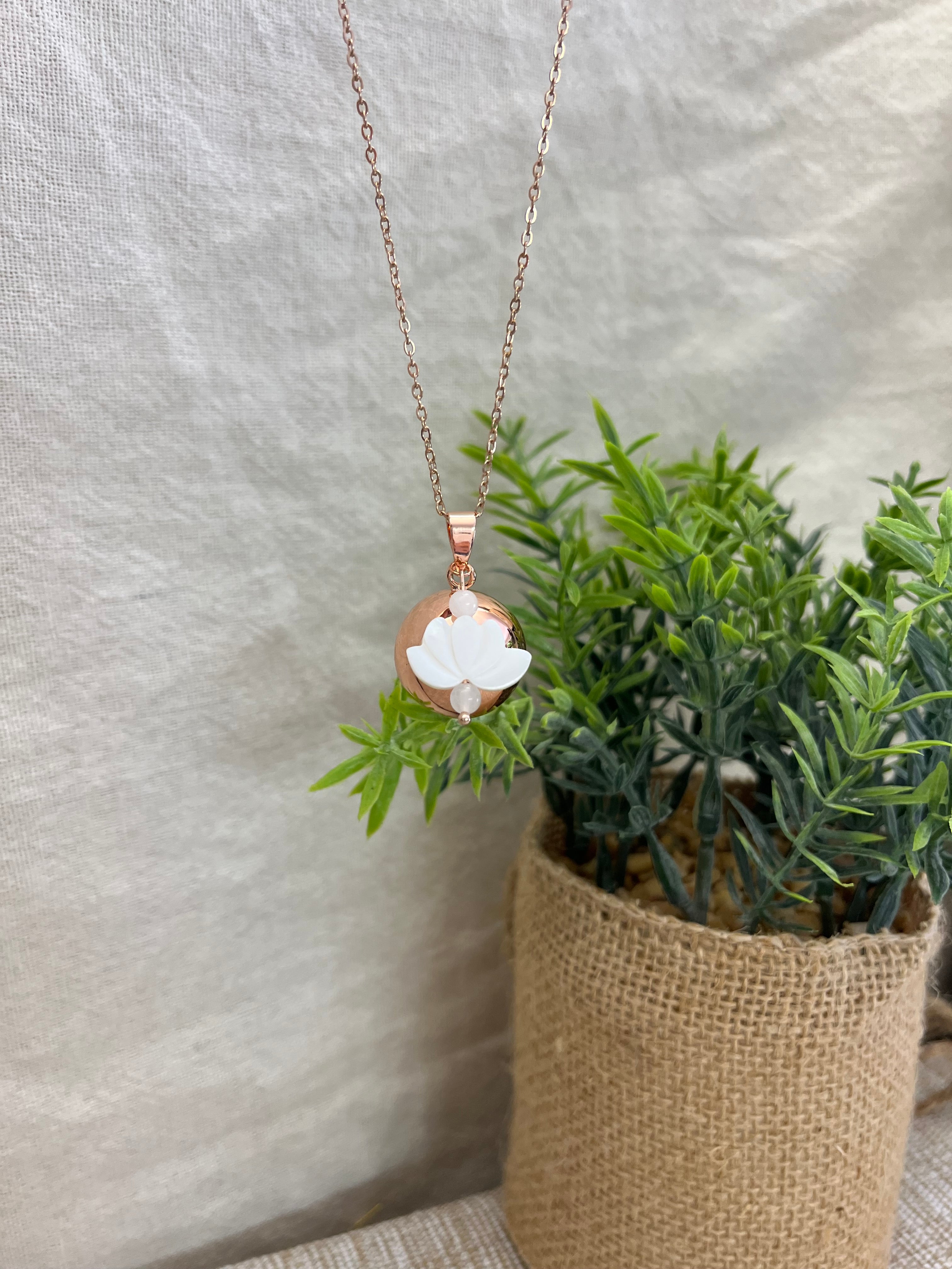 Chaîne en acier inoxydable de 105 à 110 cm, bola de grossesse en plaqué or rose, garanti sans nickel, sans plomb et sans cadmium. Le bola est accompagné d'une fleur de lotus en nacre et deux petites perles blanches en quartz.