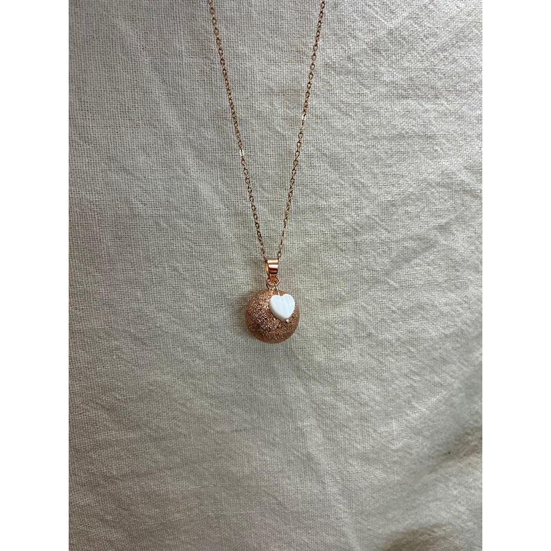 Dimensions & matériaux : Chaîne en acier inoxydable et bola strass, en plaqué or rose. Petit cœur en coquillage de perles. Chaîne de 105 à 110cm.