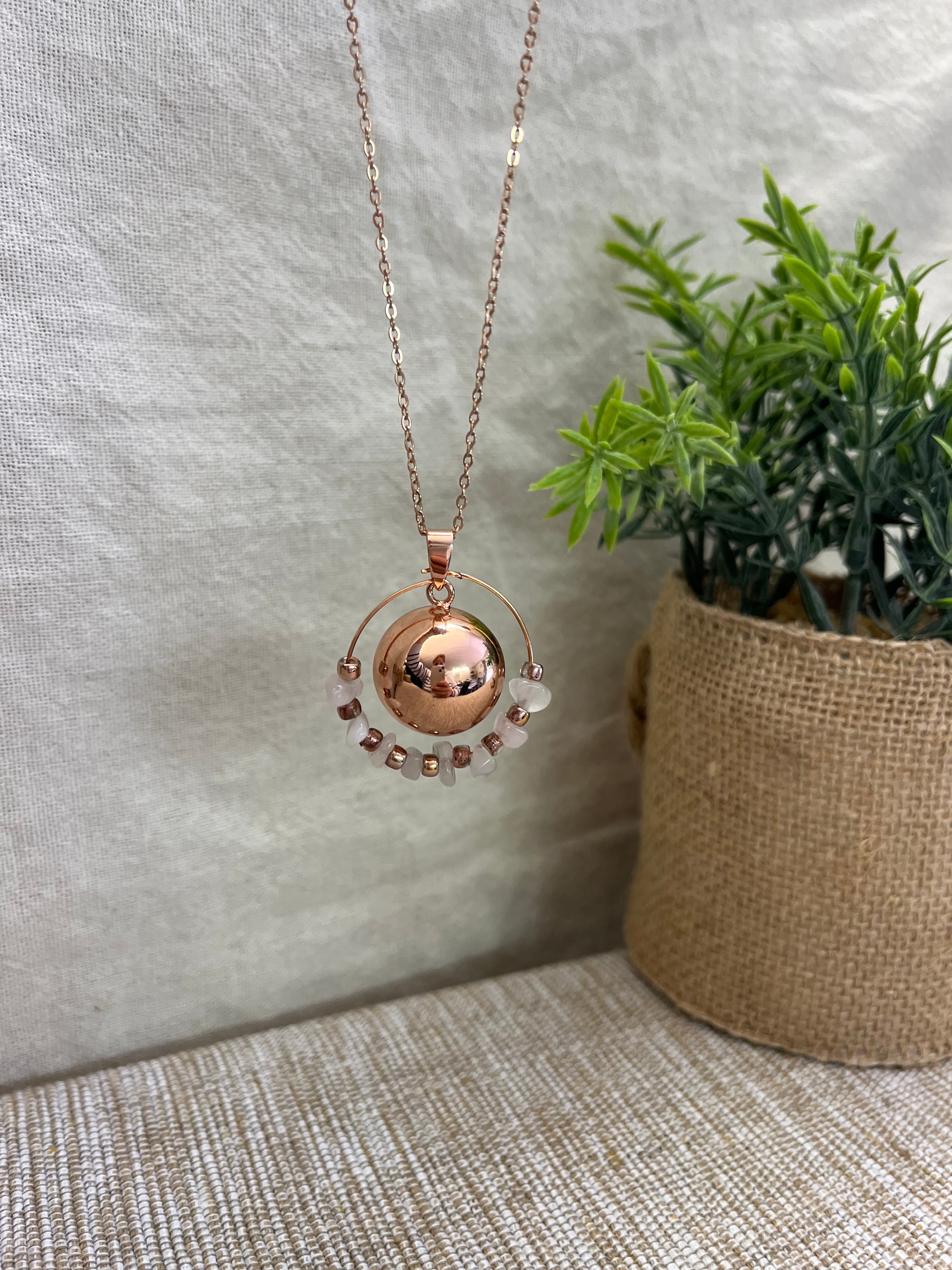 Dimensions & matériaux: Chaîne en acier inoxydable et bola en plaqué or rose. Chaîne de 105 à 110 cm. Pierres naturelles en quartz rose et perles de rocailles Matubo.
