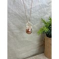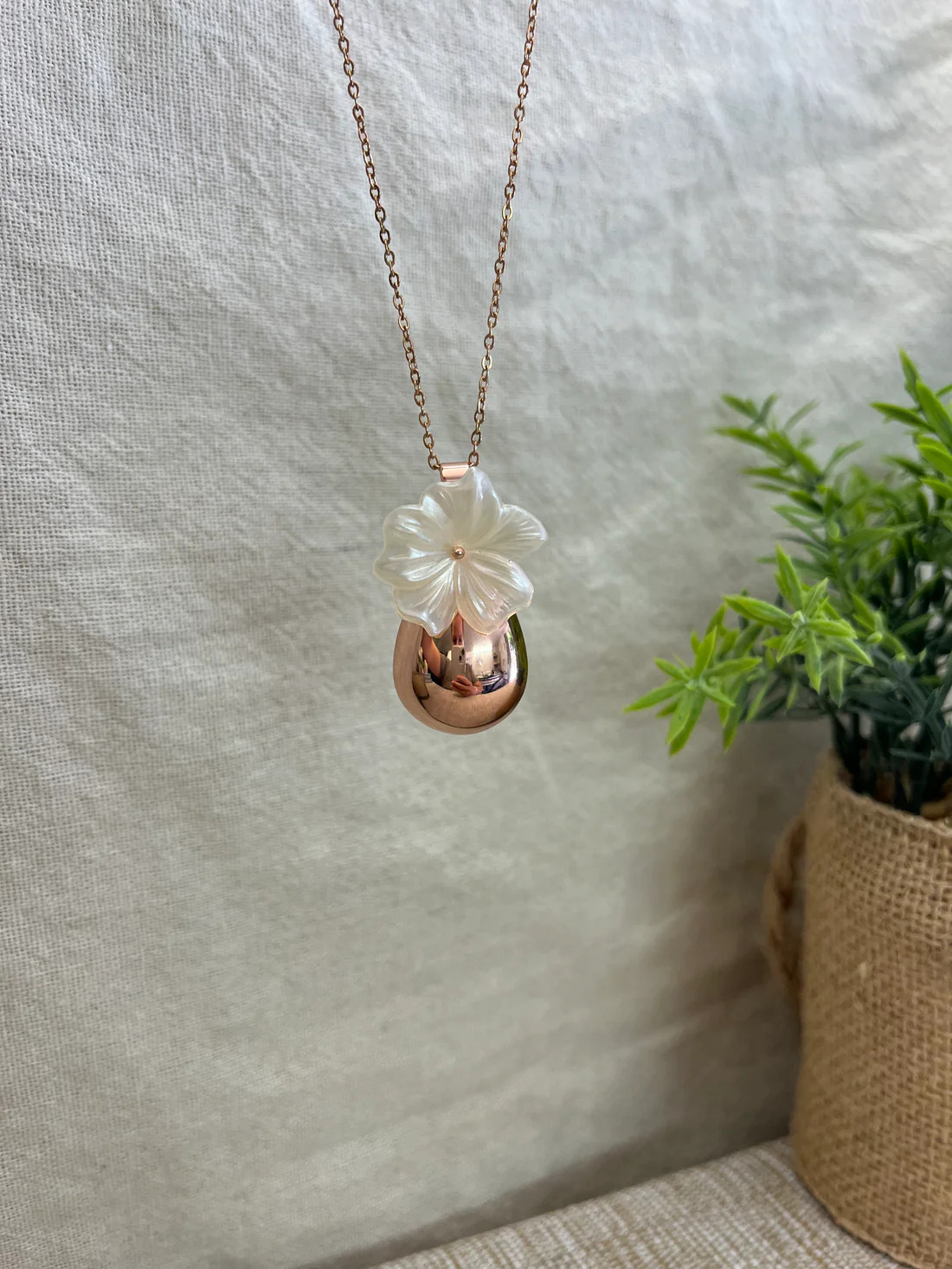 Chaîne en acier inoxydable de 105 à 110 cm. Bola de grossesse en plaqué or rose. Fleur en résine transparente de 23mm.
