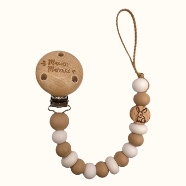 Conseils d'entretien : Laver avant la 1ère utilisation. S’entretient à l’eau chaude et savonneuse (pas de produit vaisselle, pas de stérilisateur ni lave-vaisselle). Pour les perles en bois, ne pas les immerger dans l’eau : risque de fissure (préférez un chiffon doux).