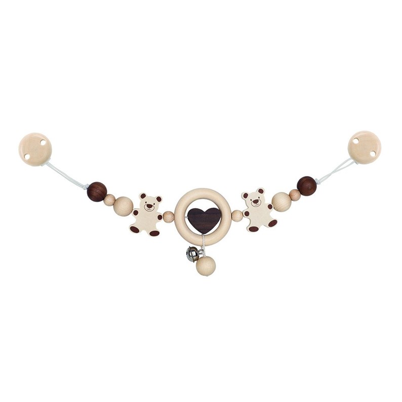 Chaîne pour poussette oursons nature de la gamme Heimess nature. Les articles de cette gamme sont fabriqués avec des bois issus exclusivement de forêts locales gérées durablement. Ils sont adaptés aux bébés souffrant d'allergie ou de problèmes de déficiences immunitaires. L'emballage en carton n'utilise aucun plastique.