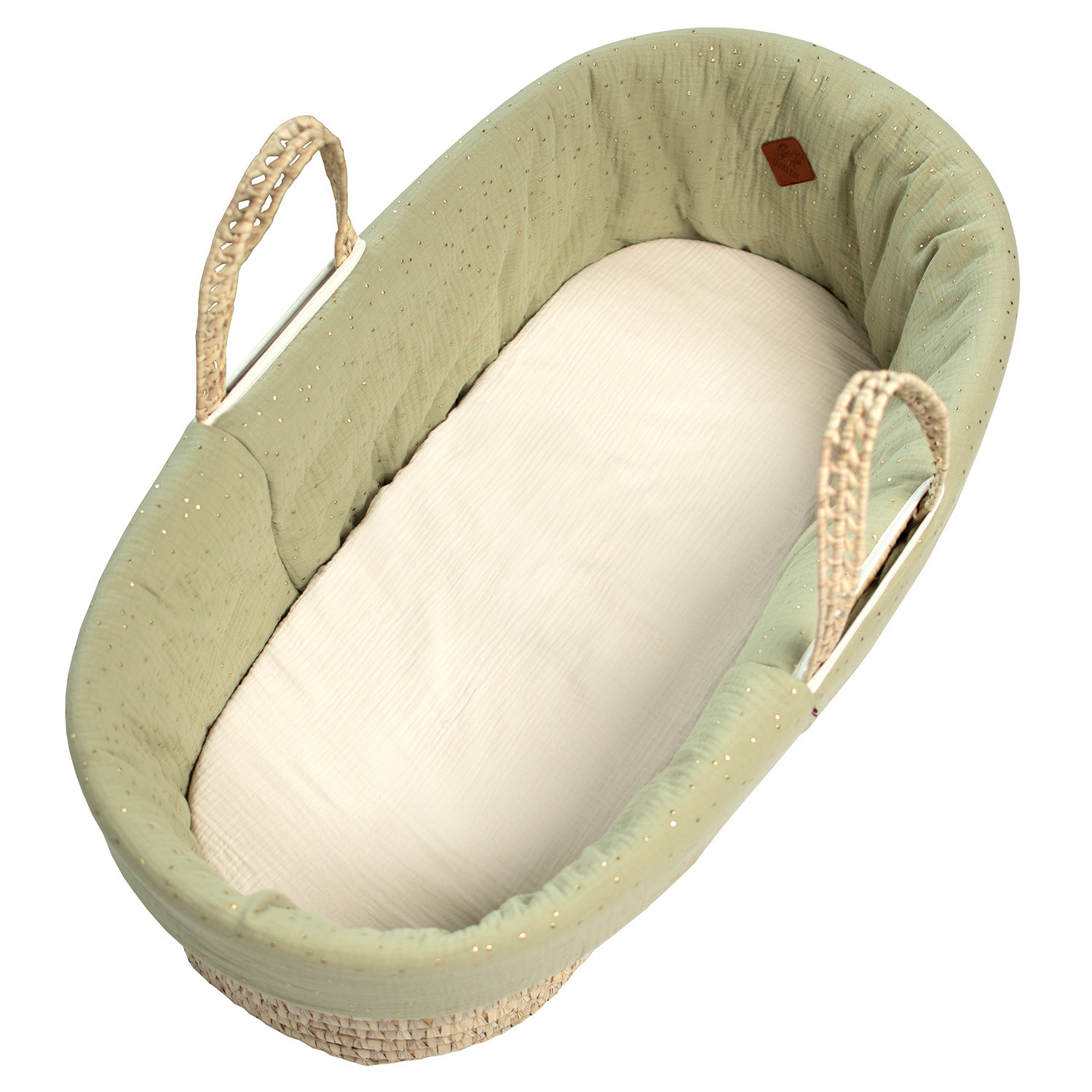 Découvrez notre habillage de couffin Sevira Kids, réalisé en gaze de coton ornée de délicats pois dorés, fabriqué avec attention en France. Cet ensemble élégant inclut une housse pour couffin et un drap housse assorti , conçus pour s'ajuster à la majorité des couffins en osier disponibles sur le marché.