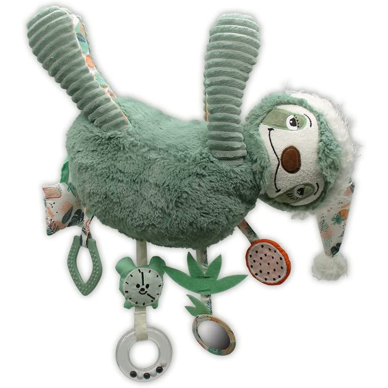 Un paresseux plein d'activités d'éveil qu'on emmène et qu'on accroche partout grâce à ses pattes en velcro : au lit, à la poussette ou même à son bras !