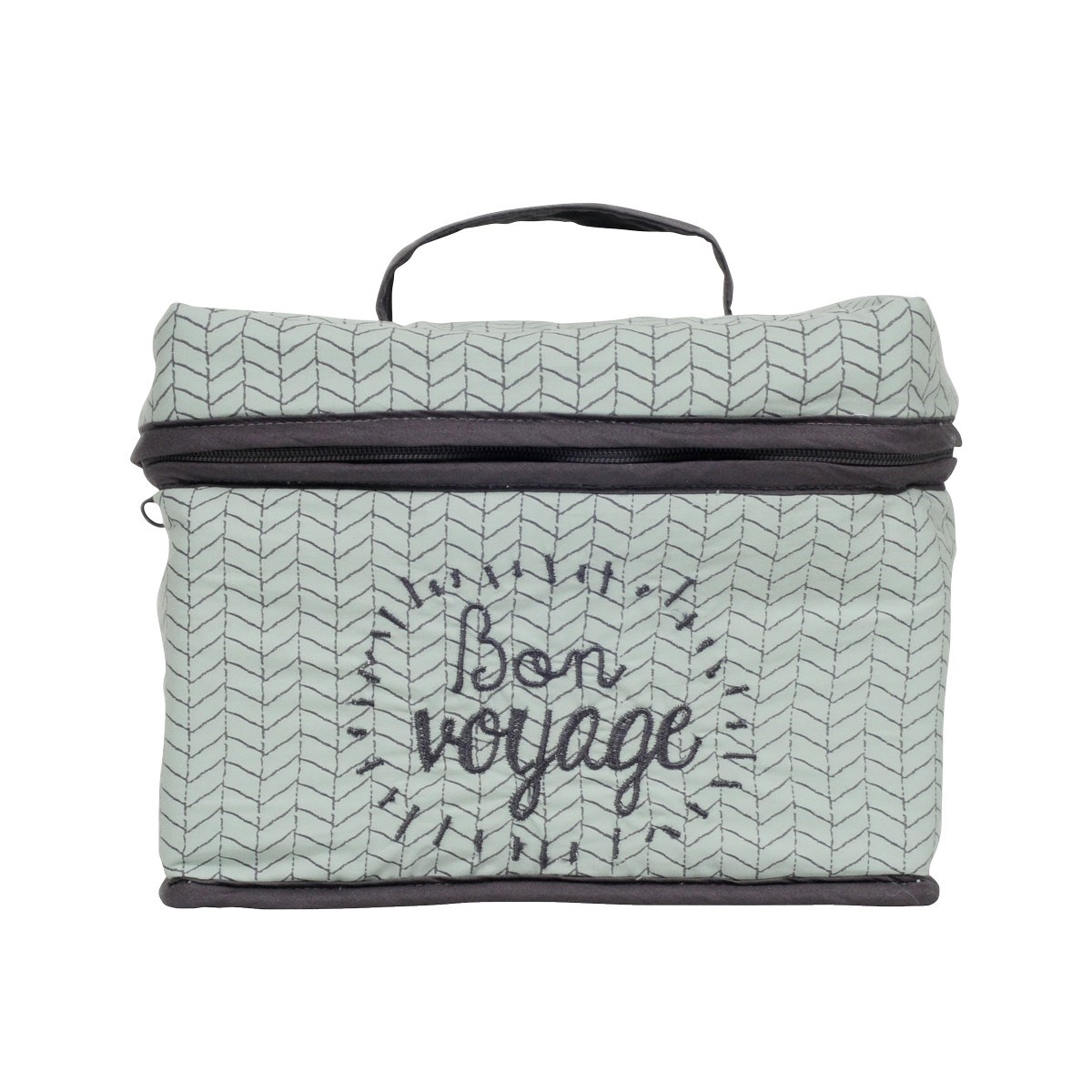 En coton bio* coloris vert d'eau imprimé chevrons. Belle broderie "bon voyage" sur le devant.