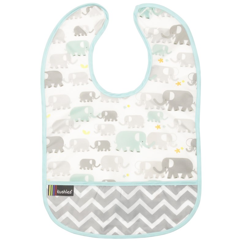 Le bavoir Kushies 12-36 mois Elephants est fabriqué à partir d'un tissu imperméable léger, le taffeta. Sans plomb, phtalate, PVC ni BPA.