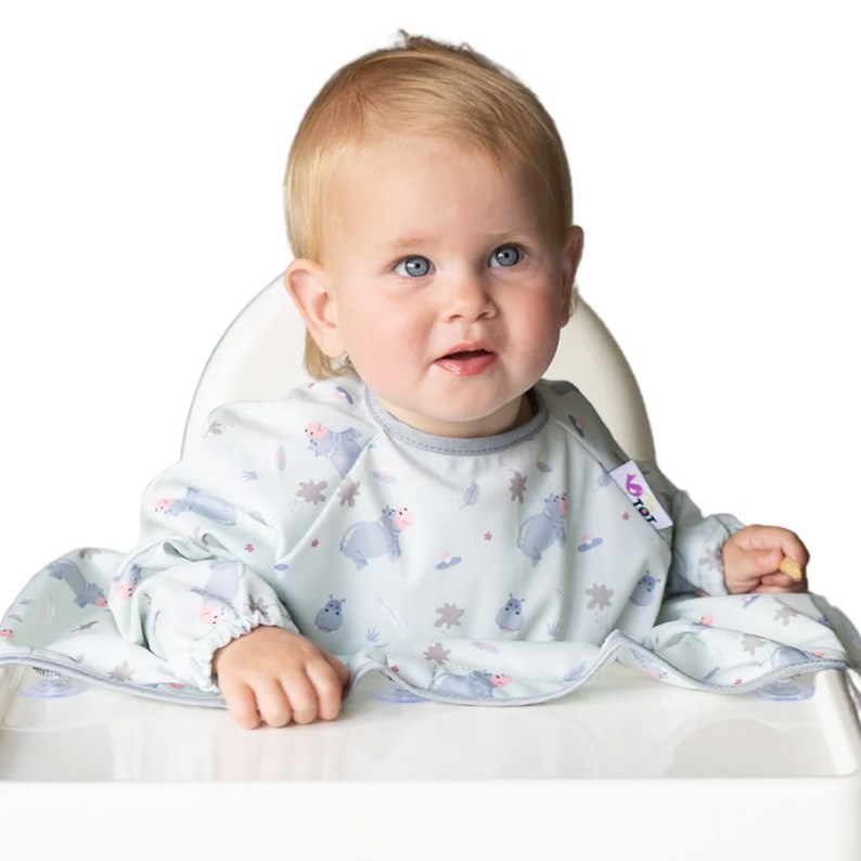 Le Bavoir Manches longues nomade Taille unique Hippos de Tidy Tot vous permettra d'avoir partout avec vous un bavoir en tissu imperméable pour que bébé puisse manger comme un grand !