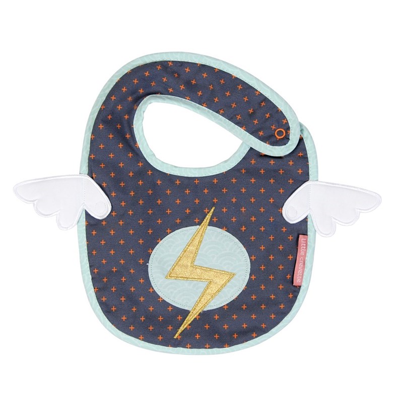Bavoir bébé brodé d'un éclair en tissu doré et doté de petites ailes sur les côtés façon super héros.