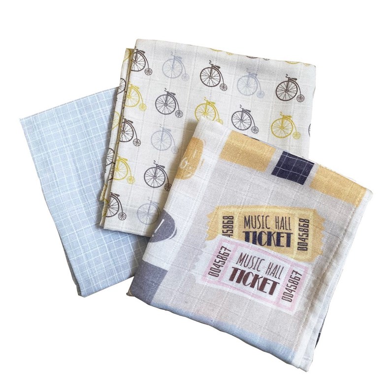 1 lange fond blanc imprimé façon affiche (motifs animaux et music-hall) + 1 lange imprimé à carreaux bleus et blancs + 1 lange imprimé de vélos multicolores