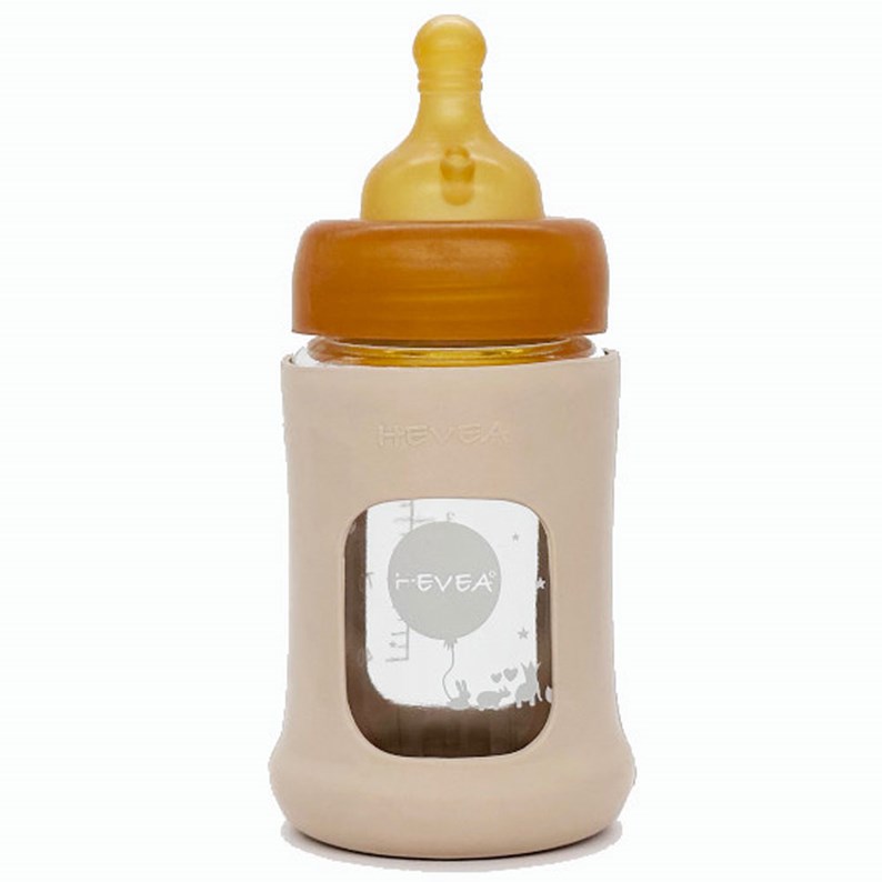 Le Biberon Sand 150ml de HEVEA est composé d'un biberon en verre borosilicate qui est reconnu pour sa grande résistance, d'une tétine et d'une housse anti-choc en caoutchouc d'hévéa 100% naturel ainsi que d'une bague et d'un capuchon hermétique.