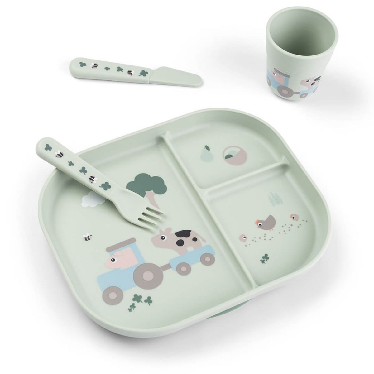 Avec ses illustrations adorables d’animaux de la ferme, ce coffret complet rend les repas plus ludiques et sereins. L’assiette compartimentée est dotée d’une ventouse puissante pour éviter les accidents à table. Fourchette, couteau et gobelet assortis sont pensés pour les petites mains et la motricité en développement.