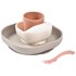 Pensé pour l’apprentissage de l’autonomie, ce coffret réunit tout le nécessaire : une assiette et un bol avec ventouse, un petit verre et une cuillère ergonomique 2ème âge. Les ventouses maintiennent la vaisselle en place, limitant les accidents, tandis que le design incurvé des bords facilite la prise des aliments. La cuillère courte et souple, adaptée aux petites mains, assure une alimentation agréable et sécurisée.