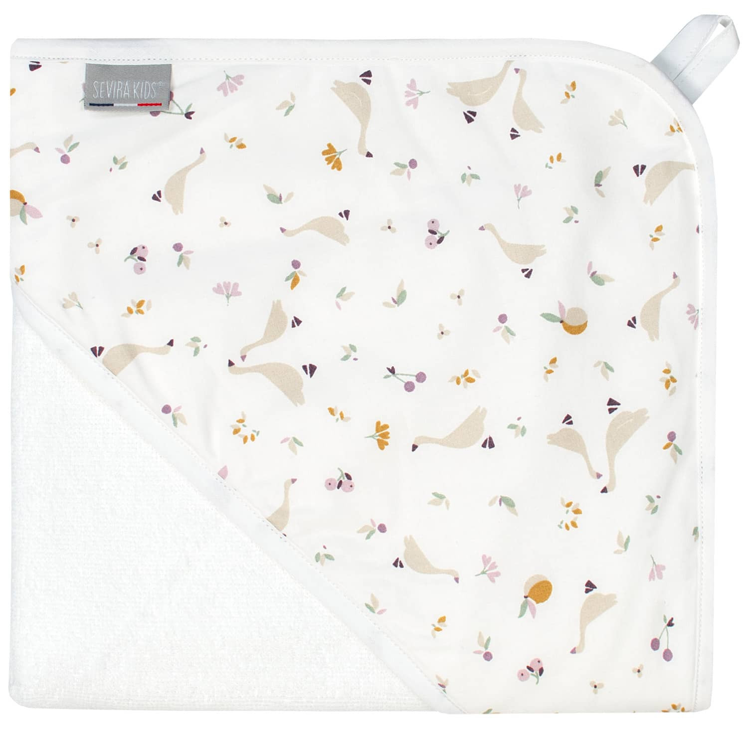La première cape de bain de bébé pour le  sécher tout en douceur  à la  sortie du bain ou de la piscine  grâce à l'alliance de la  viscose de bambou et du coton . Le design minimaliste de la  Collection Sidonia  parsemée de fleurs et d'adorables petites oies aux teintes chaleureuses, pour une sortie de bain réconfortante !