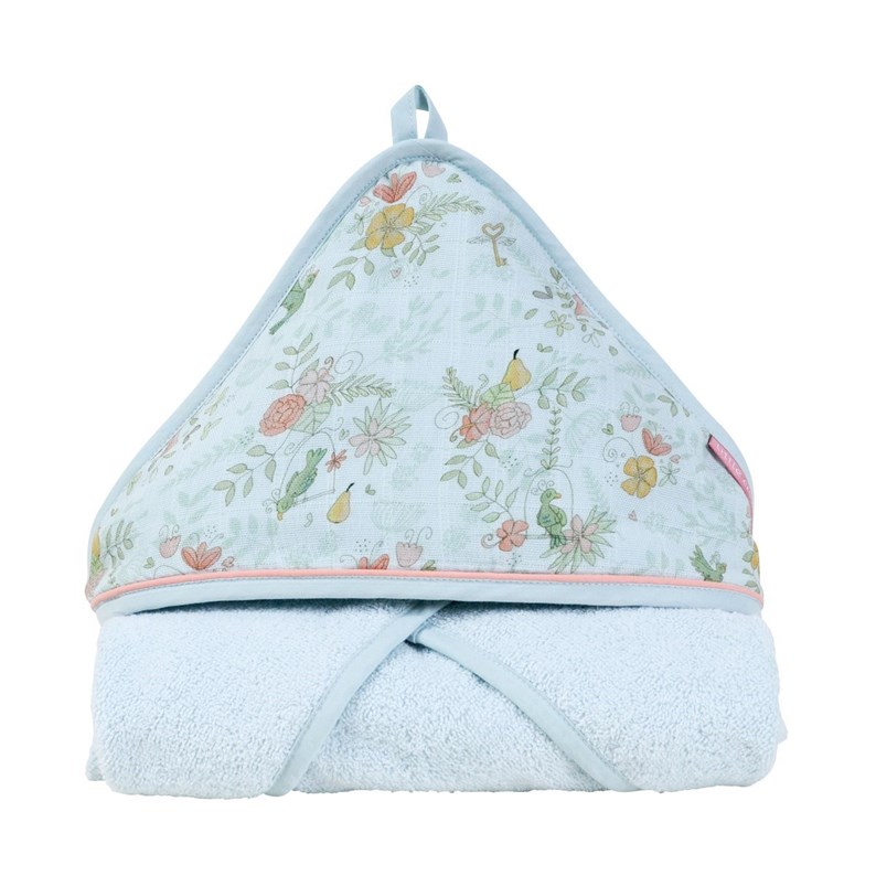 Une adorable cape de bain bébé fille bleue aqua à croquer avec son magnifique imprimé d'oiseaux et de fleurs tropicales !