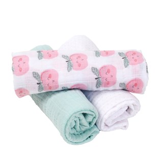 1 lange vert tendre + 1 lange imprimé pois roses + 1 lange imprimé de pommes roses.