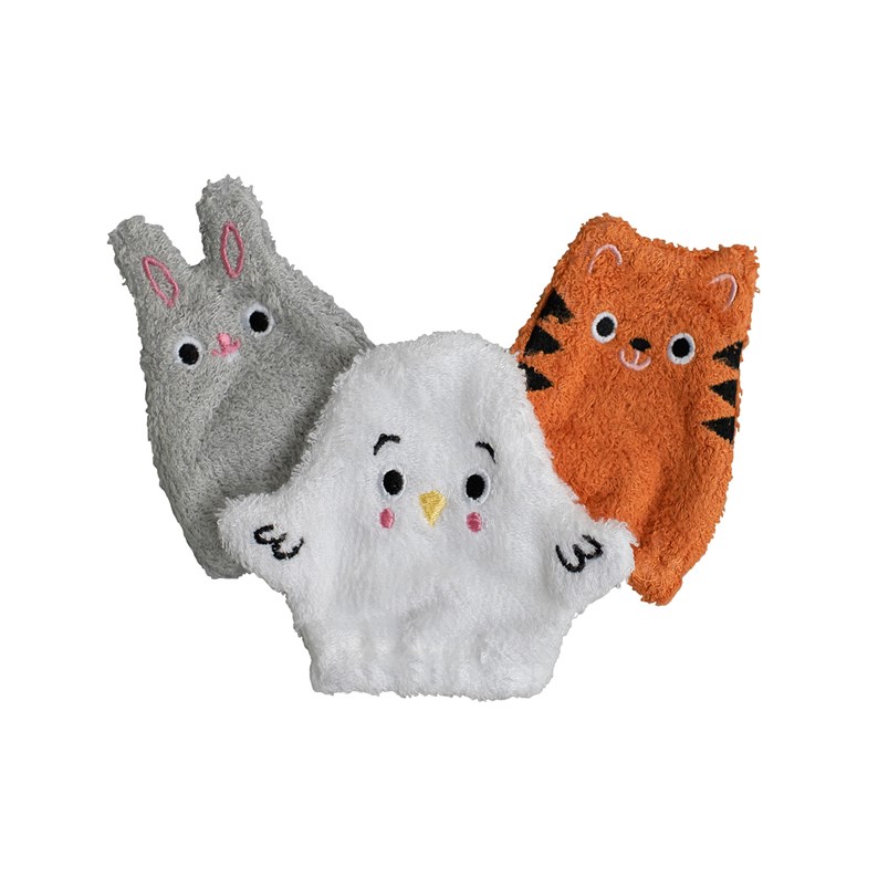 - 3 gants pour bébé : Tigre orange, Lapin gris et Hibou blanc