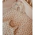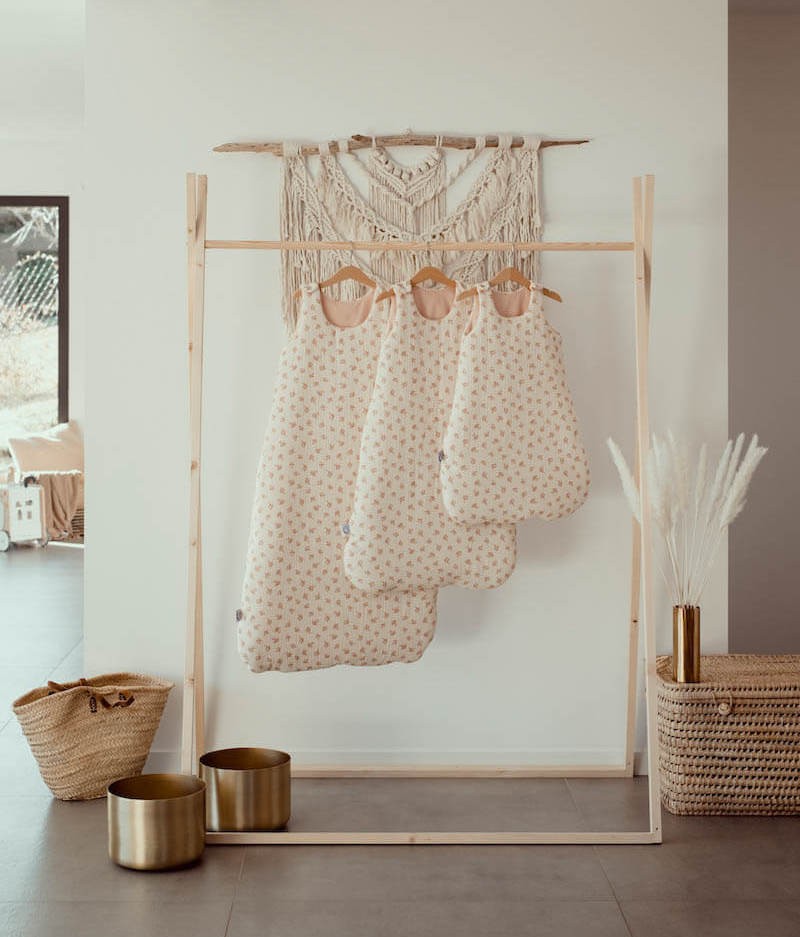 Extérieur en double gaze écru à motifs fleuris rose et intérieur en coton uni tout doux couleur rose nude certifiés OEKO TEX et ouate hypoallergénique.