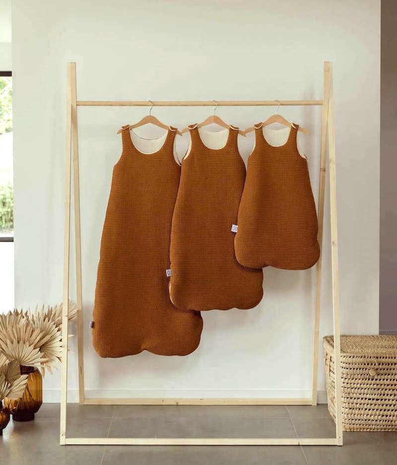 Extérieur en nid d'abeille caramel et intérieur en double gaze de coton écru certifiés OEKO TEX.