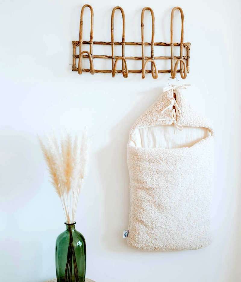 Extérieur en moumoute écru et intérieur et liens en double gaze écru certifiés OEKO TEX garni de ouate hypoallergénique.