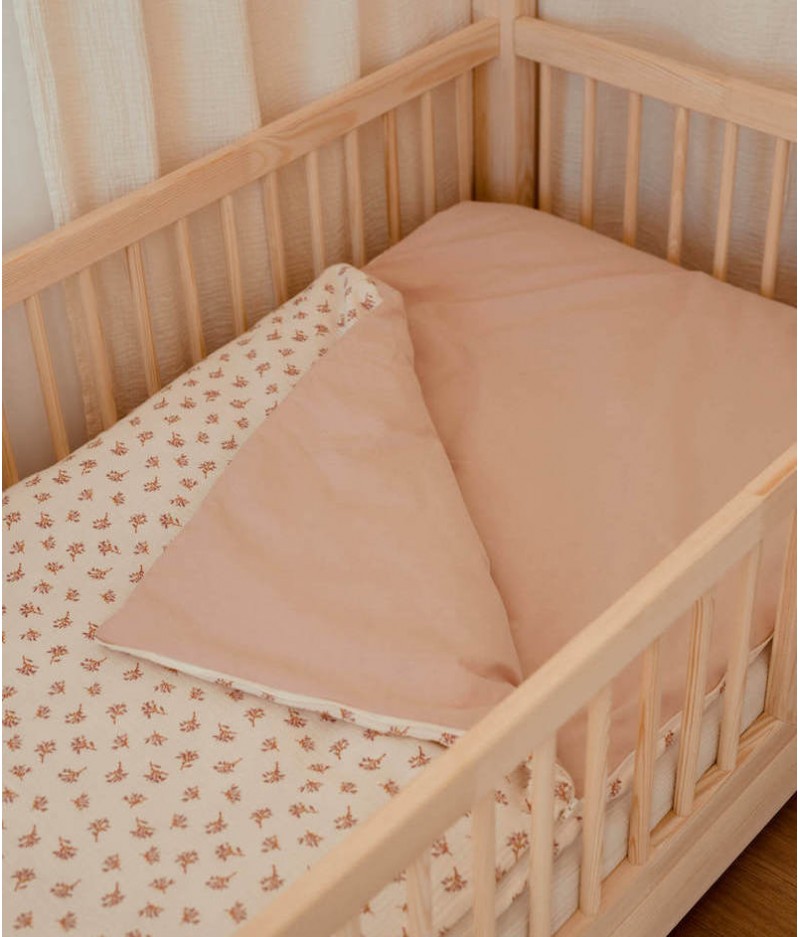Extérieur en double gaze de coton écru à motifs fleuris roses et intérieur en coton uni tout doux couleur rose nude certifiés OEKO TEX.